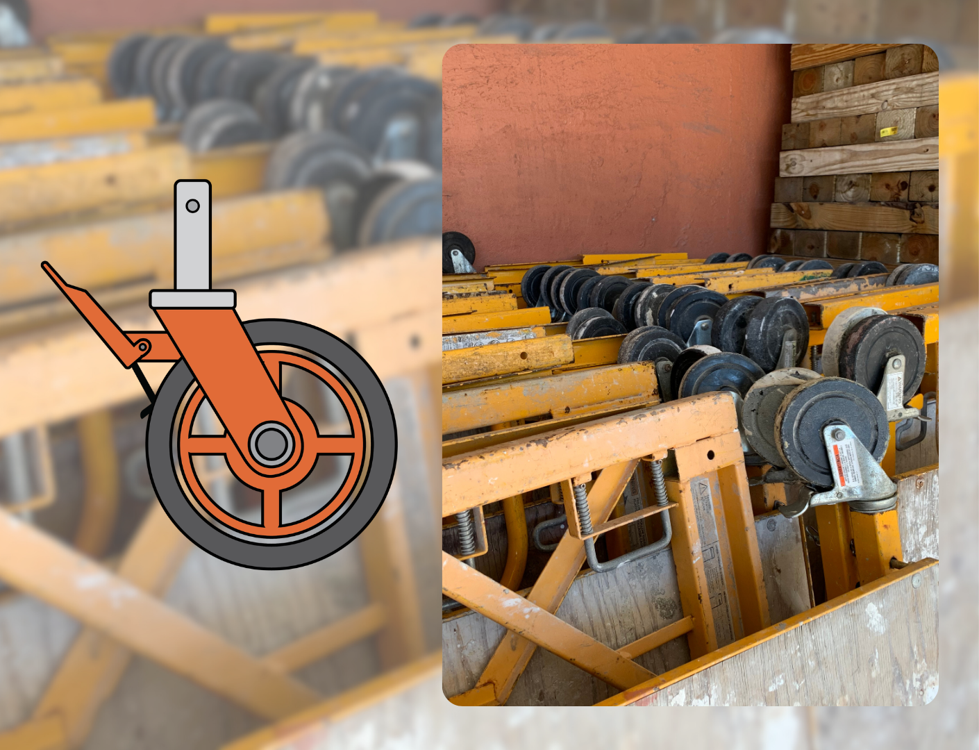 A wheel that has a swivel joint and a coupling pin attachment to go into the base of a scaffold. Made for indoor and outdoor, these can be used to creating a rolling tower as well as into the ends of outriggers to create a more stability rolling platform.
